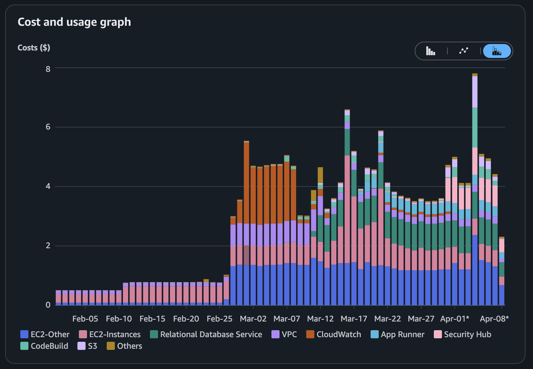 Monthly AWS spend since project start - each step up corresponds to a new service added to the stack.
