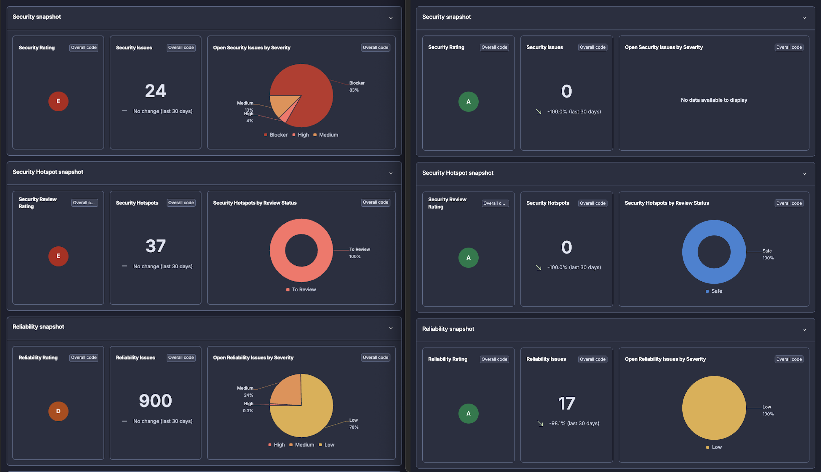 - DevSecOps baseline and remediation: Snyk, Dependabot, SonarCloud, Semgrep, AWS Inspector, and Security Hub, starting from a legacy codebase with no existing coverage and working through to A ratings across all quality and security dimensions. The before and after here are significant, and that story gets its own posts.