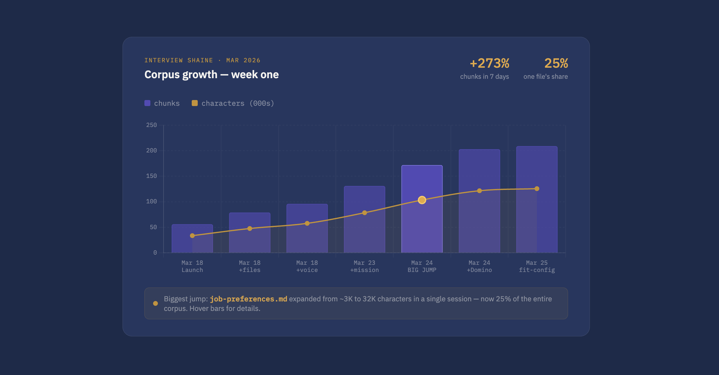 The biggest single jump wasn't adding new files - it was rewriting one. job-preferences.md went from about 3,000 characters to over 32,000 in a single session and is now roughly 25% of the entire corpus. That file covers what I look for in a role: industry, domain, team dynamics, travel preferences, what's important and what isn't. None of that was in any resume. Through this tool, it's retrievable.