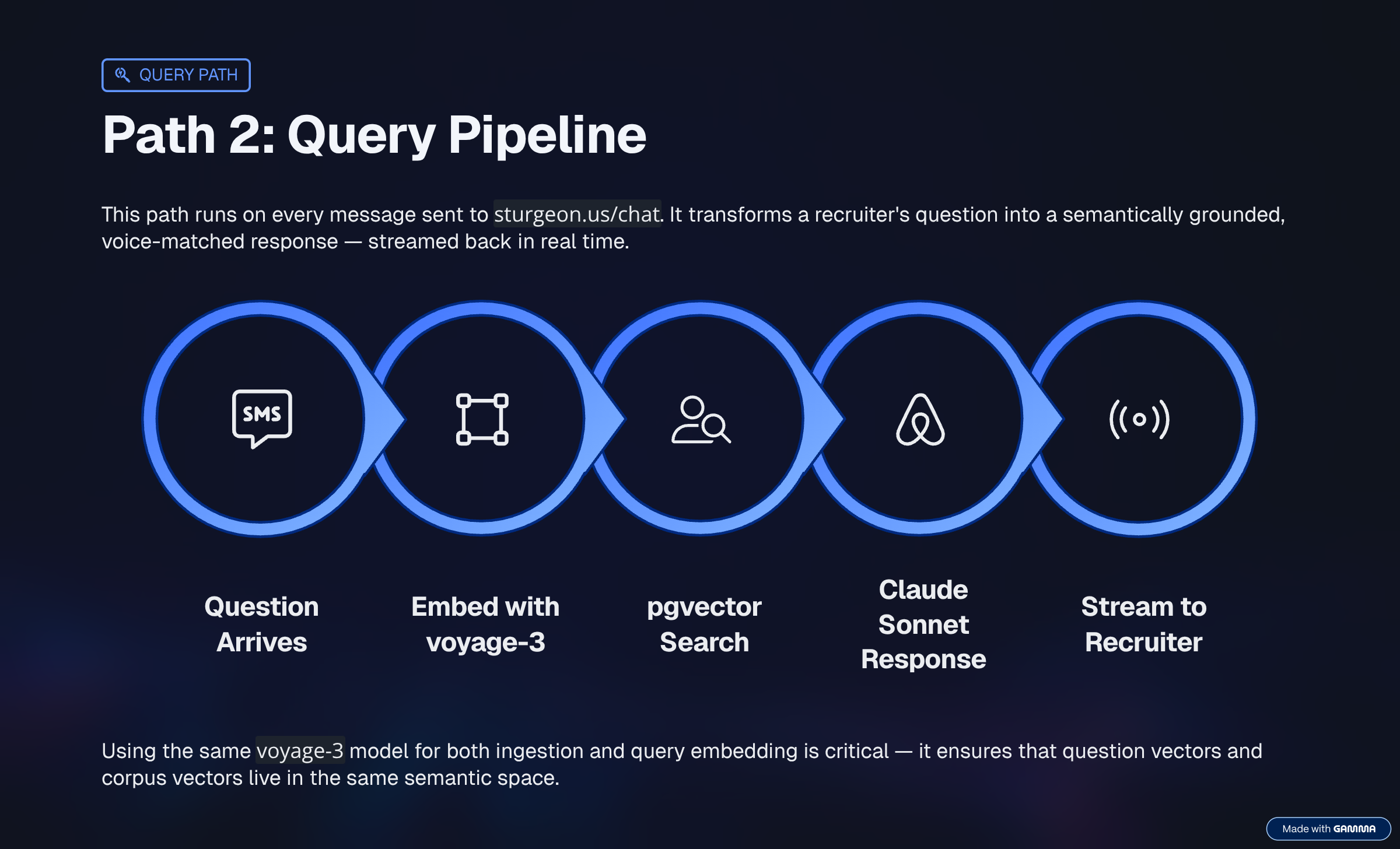Two separate models, doing different jobs. Voyage AI (voyage-3) handles embedding: converting text into vectors so we can measure semantic similarity. Claude (claude-sonnet-4-6) handles generation: reading the retrieved context and producing a response in my voice.